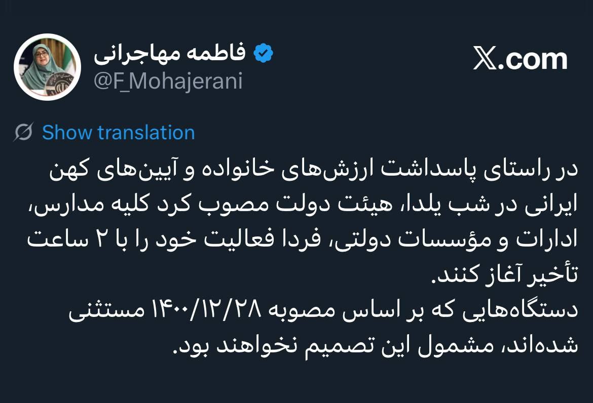 به گزارش پایگاه خبری فردای عالیشاهی ، فاطمه مهاجرانی سخنگوی دولت با انتشار پیامی در حساب کاربری خود در شبکه اجتماعی ایکس اعلام کرد: در راستای پاسداشت ارزش‌های خانواده و آیین‌های کهن ایرانی در شب یلدا، هیأت دولت مصوب کرد که کلیه مدارس، ادارات و مؤسسات دولتی، فردا فعالیت خود را با ۲ ساعت تأخیر آغاز کنند.