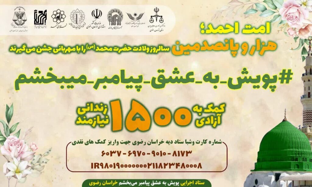 به گزارش خبرنگار مهر، پویش مردمی و اجتماعی «به عشق پیامبر میبخشم» به مناسبت هزار و پانصدمین سالروز میلاد با سعادت حضرت محمد مصطفی (ص) با هدف کمک به آزادی یکهزار و ۵۰۰ زندانی نیازمند در خراسان رضوی بهطور گسترده در سطح استان آغاز شد.