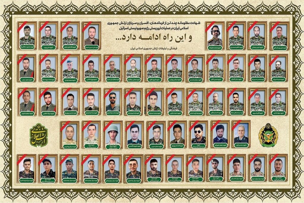 به گزارش خبرگزاری مهر، امیر سرتیپ محمد محمودی معاون اجرایی ارتش جمهوری اسلامی ایران گفت: آئین گرامیداشت ۵۷ شهید اقتدار ارتش که در تجاوز ناجوانمردانه دشمن صهیونی به شهادت رسیدند روز سهشنبه ۲۴ تیرماه ساعت ۱۰:۳۰ در مسجد امام خمینی (ره) ستاد فرماندهی کل ارتش و با حضور خانوادههای معظم شهدا، ایثارگران و جمعی از مسئولان لشکری و کشوری برگزار خواهد شد.