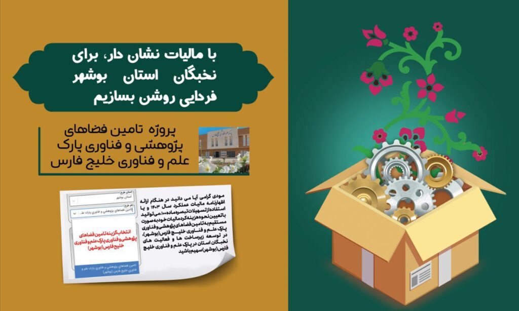 بوشهر- ایرنا- رئیس پارک علم و فناوری خلیج فارس بوشهر گفت: در قالب طرح نوین «نشاندار کردن مالیاتها»، مودیان مالیاتی میتوانند سهم خود را مستقیم به پروژه «تأمین فضاهای پژوهش و فناوری این پارک اختصاص دهند که تحقق این مهم گامی مؤثر در توسعه زیرساختهای علمی و حمایت از صنایع دانشبنیان استان است.