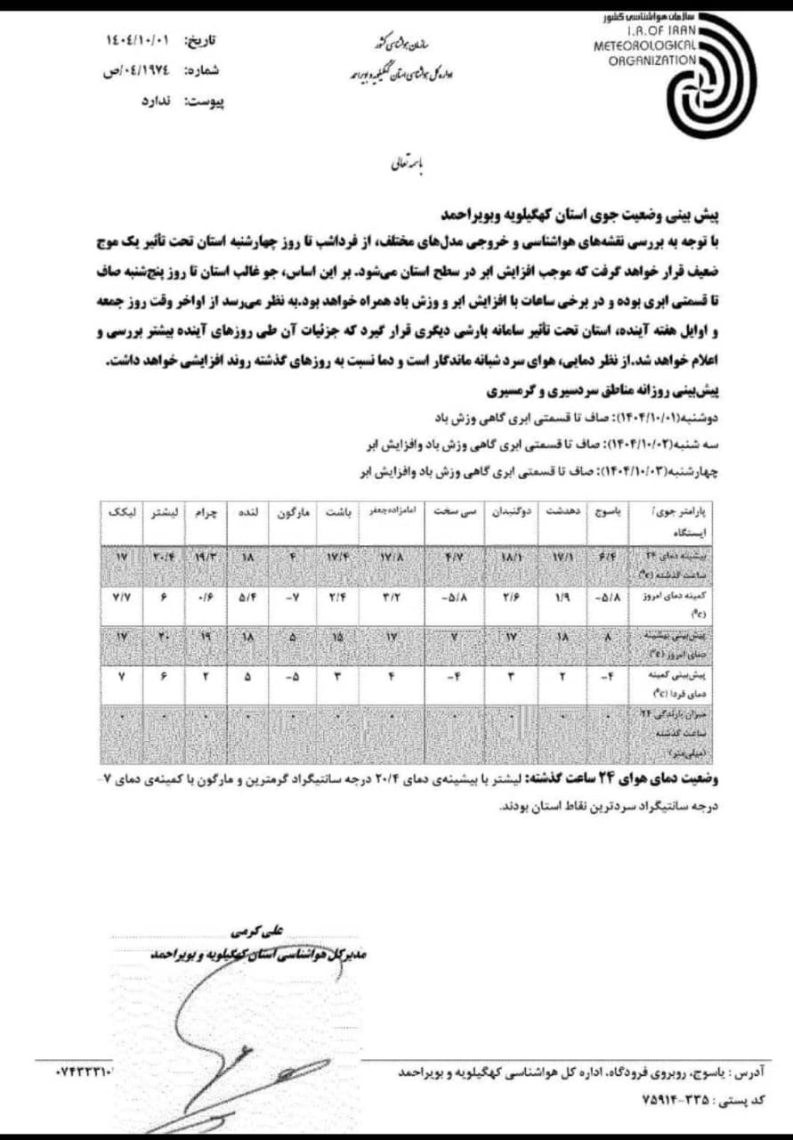 کرمی تأکید کرد: اطلاعات ارائهشده بر اساس دادههای رسمی مرکز پیشبینی هواشناسی استان کهگیلویه و بویراحمد تهیه شده و بهصورت روزانه بهروزرسانی میشود.