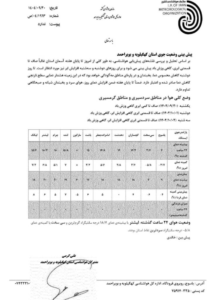 مدیرکل هواشناسی کهگیلویه و بویراحمد تأکید کرد: هشدار سطح زرد کاهش دما همچنان معتبر است و شهروندان، کشاورزان و دامداران باید توصیههای هواشناسی را جدی بگیرند.