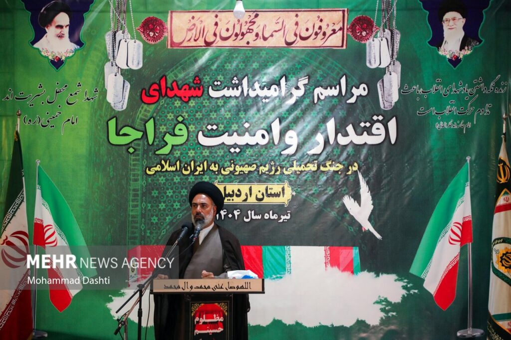 به گزارش خبرنگار مهر، حجت الاسلام سیدکمال موسوی ظهر دوشنبه در آئین بزرگداشت شهدای اقتدار و امنیت در مسجد میرزاعلی اکبر اردبیل اظهار کرد: دشمنان ملت ایران به خیال خام خود جنگ ۱۲ روزهای را به ایران تحمیل کردند تا مانع از پیشرفت و توسعه کشور شوند اما بعد از ۱۲ روز در برابر این ملت و اقتدار آنها دست تسلیم خود را بالا بردند.