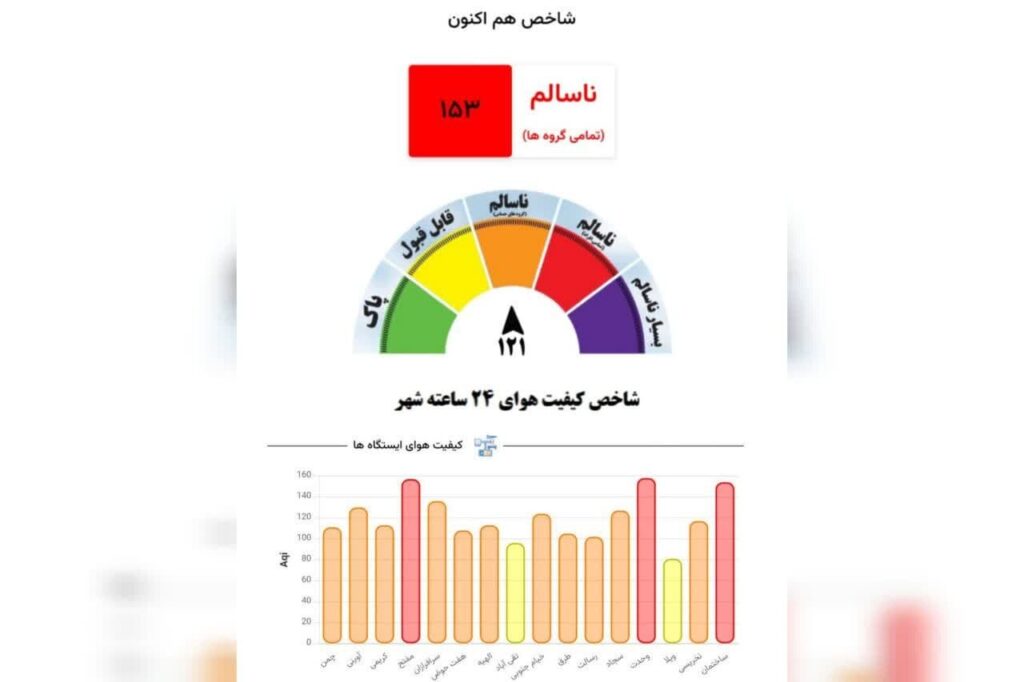 به گزارش خبرنگار مهر، بر اساس دادههای مرکز پایش آلایندههای زیست محیطی مشهد شاخص لحظهای هوای مشهد امروز جمعه سی و یکم مردادماه با ثبت عدد ۱۵۴ در شرایط ناسالم برای تمامی گروهها قرار گرفت.