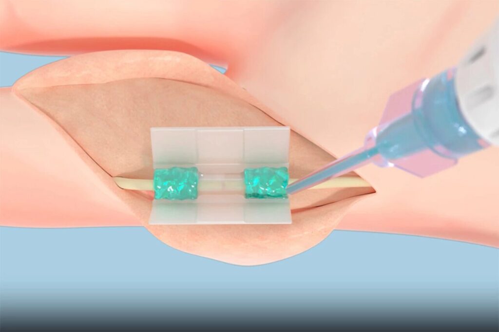 هنگامیکه پلیمر روی زخم به کار می رود و به طور کامل می چسبد، پوشش آن برداشته و برش ایجاد شده بسته میشود. این پلیمر به ایجاد اتصالی محکم بین انتهای عصبها کمک میکند و سپس از طریق فرآیند هیدرولیز حل میشود.