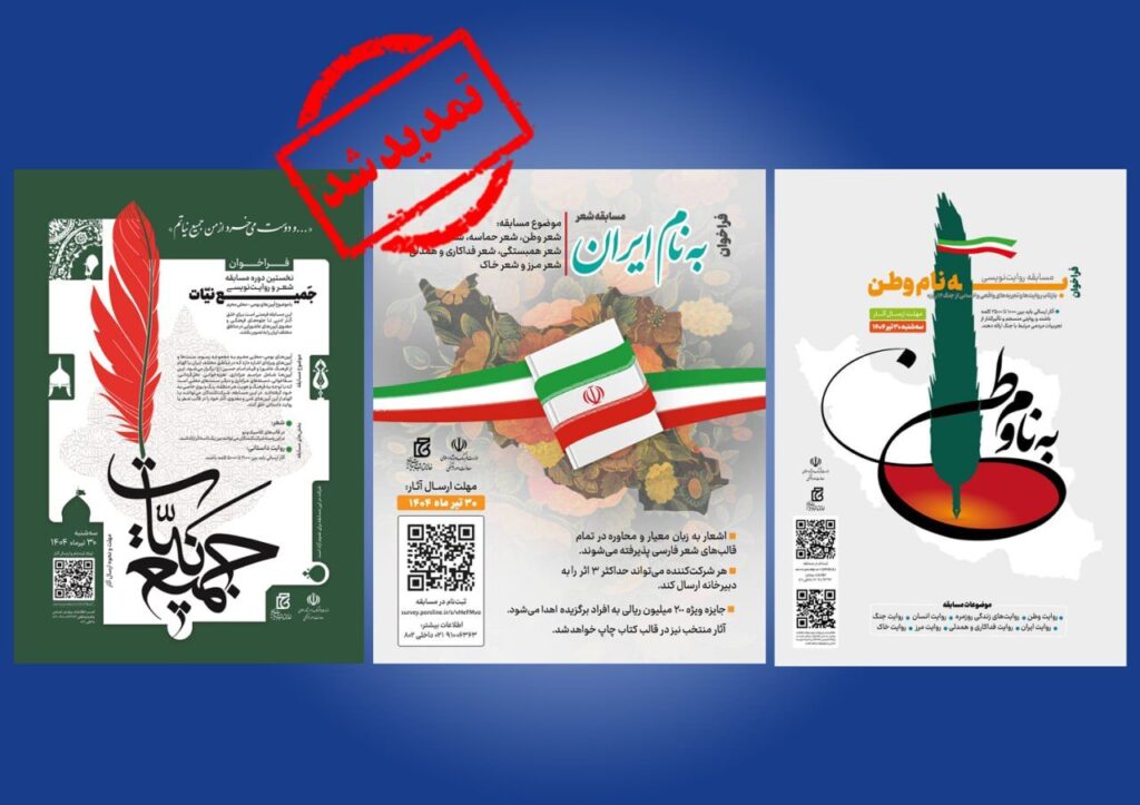 تهران- ایرنا- مهلت ارسال آثار به مسابقات ادبی «جمیع نیات»، «به نام وطن» و «به نام ایران» تا پنجم مرداد ۱۴۰۴ تمدید شد.