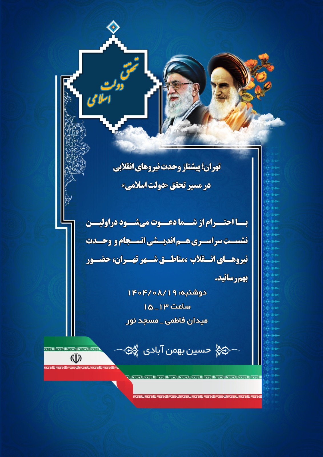 به گزارش خبرنگار سیاسی پایگاه خبری فردای عالیشاهی ؛ نشست سراسری رؤسا و اعضای شورای راهبردی نیروهای انقلاب مناطق ۲۲گانه شهر تهران با شعار «تهران؛ پیشتاز وحدت نیروهای انقلابی در مسیر تحقق دولت اسلامی»، دوشنبه ۱۹ آبان‌ماه ۱۴۰۴ از ساعت ۱۳ تا ۱۵ در مسجد نور میدان فاطمی برگزار خواهد شد.