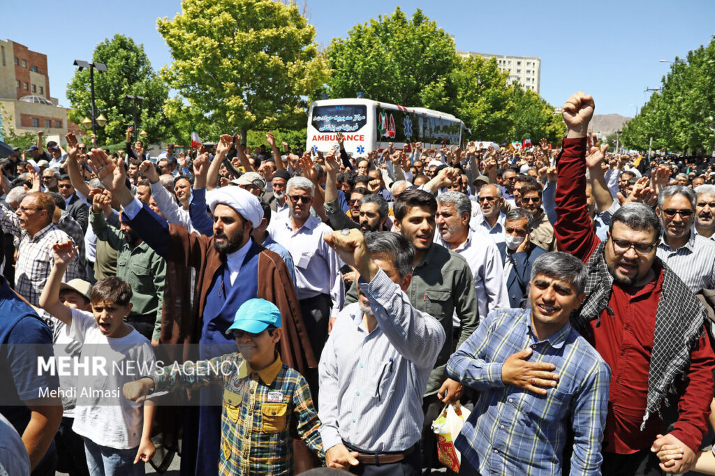شرکتکنندگان در این راهپیمایی پرشکوه، با در دست داشتن پرچمهای فلسطین و سردادن شعارهای ضدصهیونیستی و ضدآمریکایی، عزم راسخ خود را در استمرار راه شهیدان و دفاع از مظلومان عالم به رخ جهانیان کشاندند و بار دیگر بر عهد ناگسستنی ملت ایران با محور مقاومت مهر تأیید زدند.