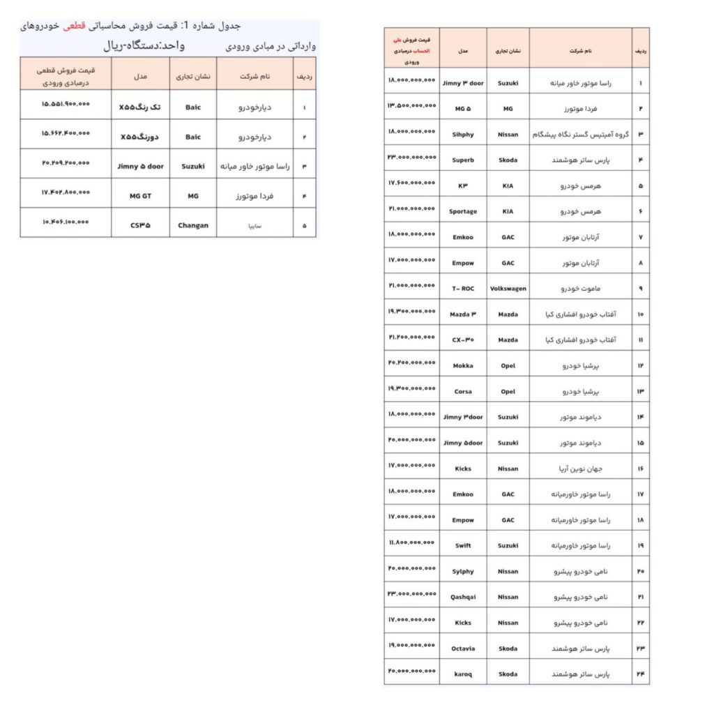 تبصره ۱- قیمت مندرج در جدول شماره ۲ ،قیمت علیالحساب در مبادی ورودی بوده و قیمت قطعی خودروهای مذکور مطابق مصوبات شورای رقابت و پس از ارایه کلیه مستندات و مدارک مثبته و براساس آخرین ضوابط قیمتگذاری مصوب هیات تعیین و تثبیت قیمتها ، توسط سازمان حمایت مصرف کنندگان و تولیدکنندگان محاسبه و متعاقباً در سامانه بارگذاری خواهد شد.بدیهی است در هنگام صدور فاکتور نهایی، هزینهها و عوارض قانونی پس از ترخیص از قبیل مالیات بر ارزش افزوده، بیمه، اسقاط خودروی فرسوده، کرایه حمل و …به قیمتهای قطعی و مصوب اضافه خواهد شد.