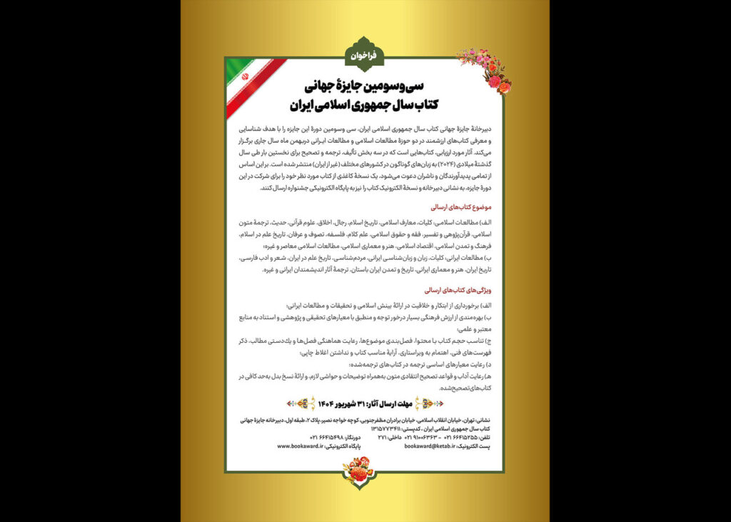 به گزارش خبرگزاری مهر، سیسومین جایزه جهانی کتاب سال جمهوری اسلامی ایران با هدف شناسایی و معرفی کتابهای ارزشمند در دو حوزه مطالعات اسلامی و مطالعات ایرانی، در سه بخش تألیف، ترجمه و تصحیح که برای نخستینبار طی سال گذشته میلادی (۲۰۲۴) به زبانهای گوناگون در کشورهای مختلف (غیر از ایران) منتشر شدهاند، در بهمن ۱۴۰۴ برگزار میشود.