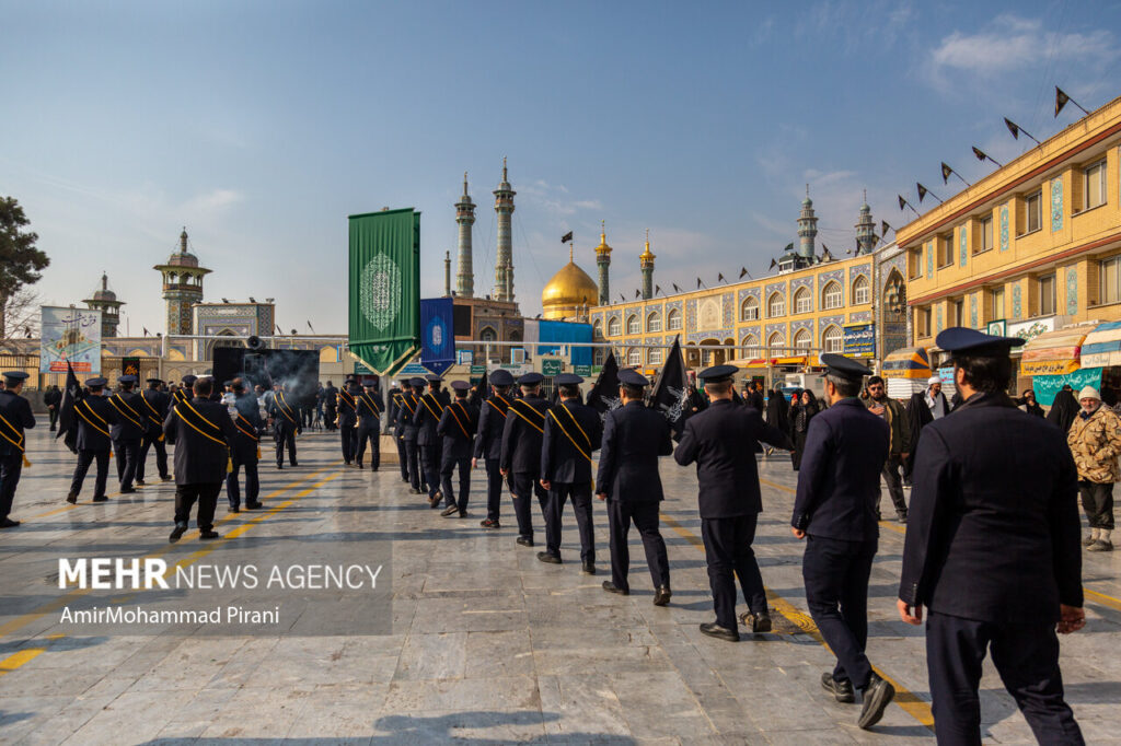 دسته خادمان حرم مطهر حضرت معصومه (س) نیز همچون سالهای گذشته از مسجد امام حسن عسکری (ع) حرکت کرده و با ورود به حرم مطهر، در آئینی نمادین مصیبت شهادت امام رضا (ع) را به خواهر گرامی ایشان تسلیت گفتند.
