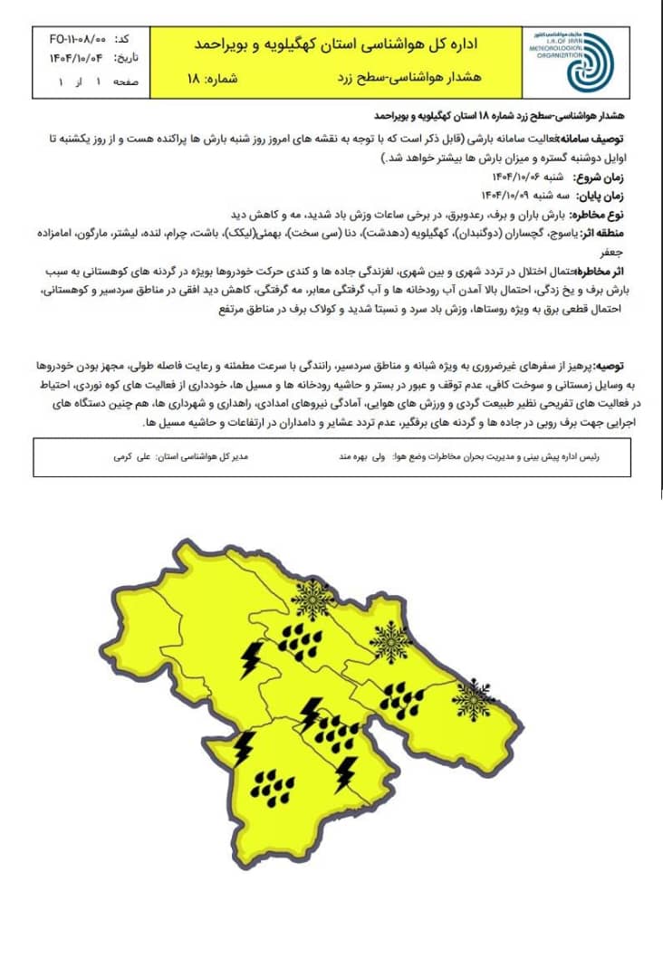 ادارهکل هواشناسی استان کهگیلویه و بویراحمد با صدور هشدار سطح زرد شماره ۱۸، نسبت به فعالیت سامانه بارشی در سطح استان هشدار داد
