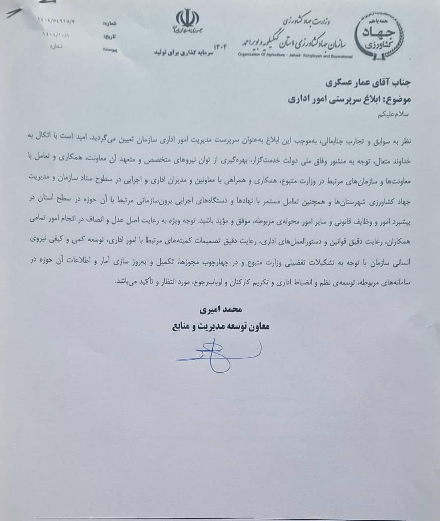 با صدور حکمی از سوی محمد امیری، معاون توسعه مدیریت و منابع سازمان جهاد کشاورزی ، عمار عسکری به عنوان سرپرست امور اداری سازمان جهاد کشاورزی استان کهگیلویه و بویراحمد منصوب شد.