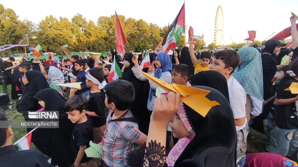مشهد- ایرنا- کودکان و نوجوانان مشهدی در اجتماع بزرگ خود به مناسبت گرامیداشت شهدای کودک و نوجوان فلسطینی، آدمک نتانیاهو و ترامپ را با موشکهای کاغذی خود هدف قرار دادند و به آتش کشیدند.