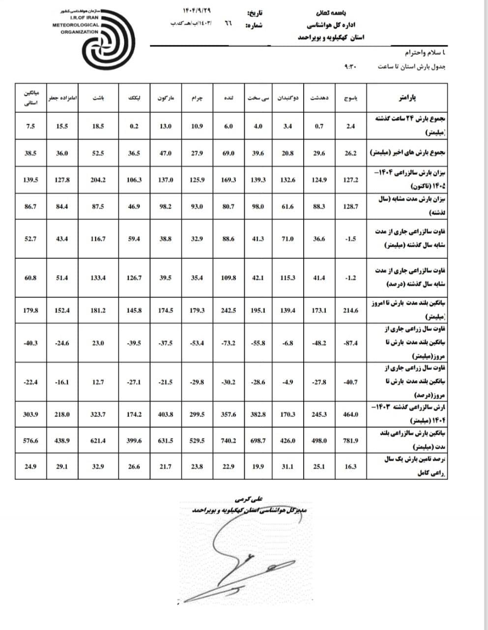 مدیرکل هواشناسی کهگیلویه و بویراحمد، میزان بارندگی ثبت‌شده ناشی از سامانه اخیر را در نقاط مختلف استان اعلام کرد.