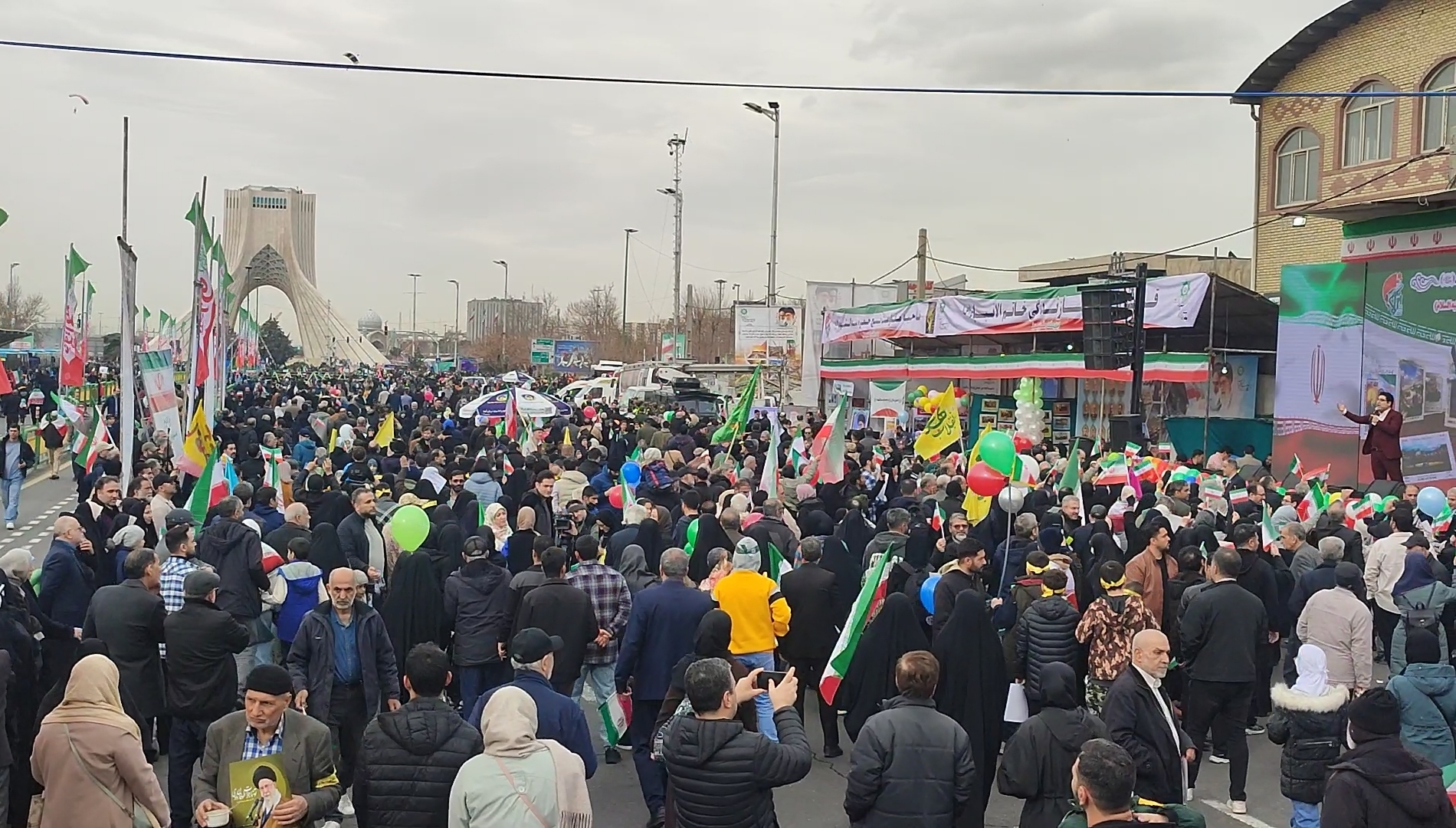 میدان آزادی به عنوان مقصد اصلی راهپیمایان، از ساعاتی پیش شاهد تجمع گسترده جمعیتی است که از نقاط مختلف پایتخت خود را به این میدان رساندهاند. خانوادهها، جوانان و نوجوانان در کنار سایر اقشار جامعه در این اجتماع حضور دارند و فضای میدان و خیابانهای اطراف سرشار از شور و نشاط مردمی است.