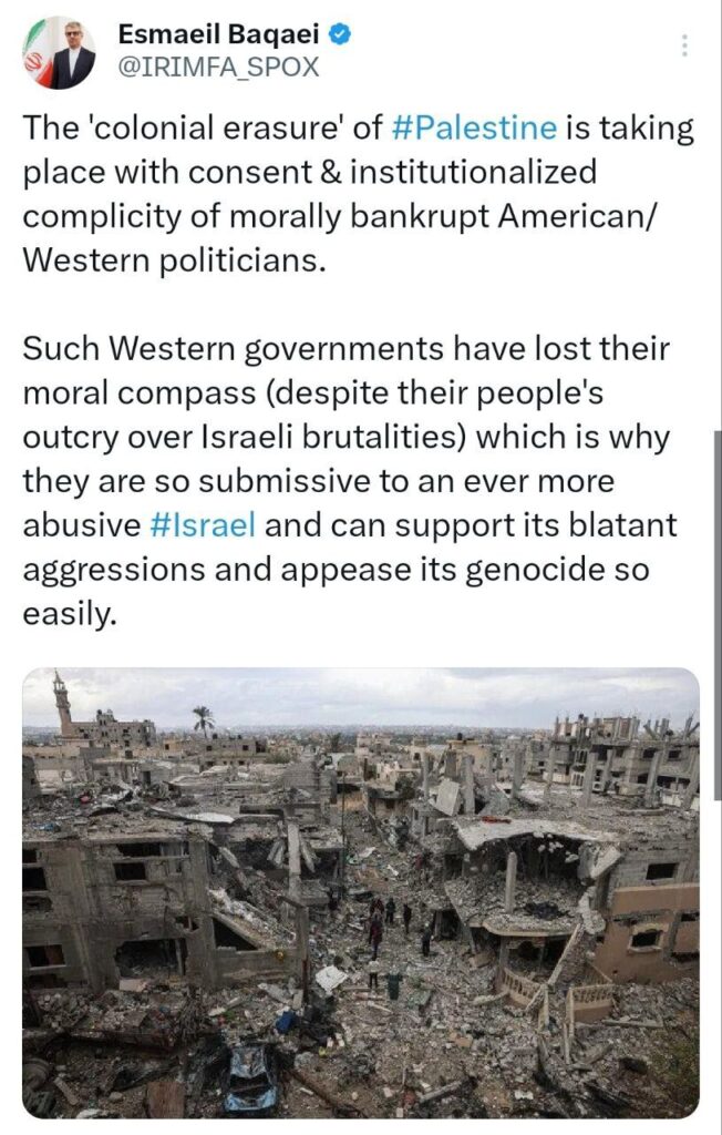 پیام وزارت خارجه در مورد همدستی برخی کشورهای غربی در استمرار نسل کشی در فلسطین