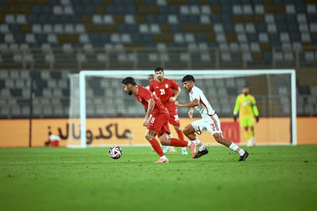 شاگردان امید روانخواه پس از تنها چند دقیقه از شروع بازی تمام و کمال توپ و میدان را مقابل میزبان در اختیار داشتند. بازیکنان زیر ۲۳ سال فوتبال ایران با گردش توپ در نقاط مختلف زمین توانستند بازی روان خود را به امارات دیکته کنند تا میزبان اسیر بازی زیبای این تیم شود.