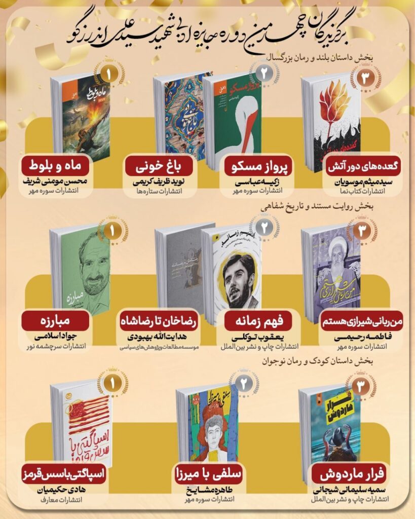 تهران- ایرنا- با برگزاری آیین اختتامیه چهارمین دوره جایزه ادبی شهید سیدعلی اندرزگو، آثار برتر با نظر گروههای داوری و هیاتهای نخبگانی اعلام شد.
